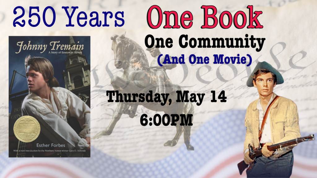 Event Type: Adult ProgramAge Group(s): Adult, Young Adult Date: 5/14/2026 Start Time: 6:00 PM End Time: 7:30 PM Description: From now until May 14 we'll have multiple copies of Ester Forbes' Johnny Tremain available for people to borrow. Then, on May 14 we'll meet up at the library to discuss the book and watch the Disney adaptation.
