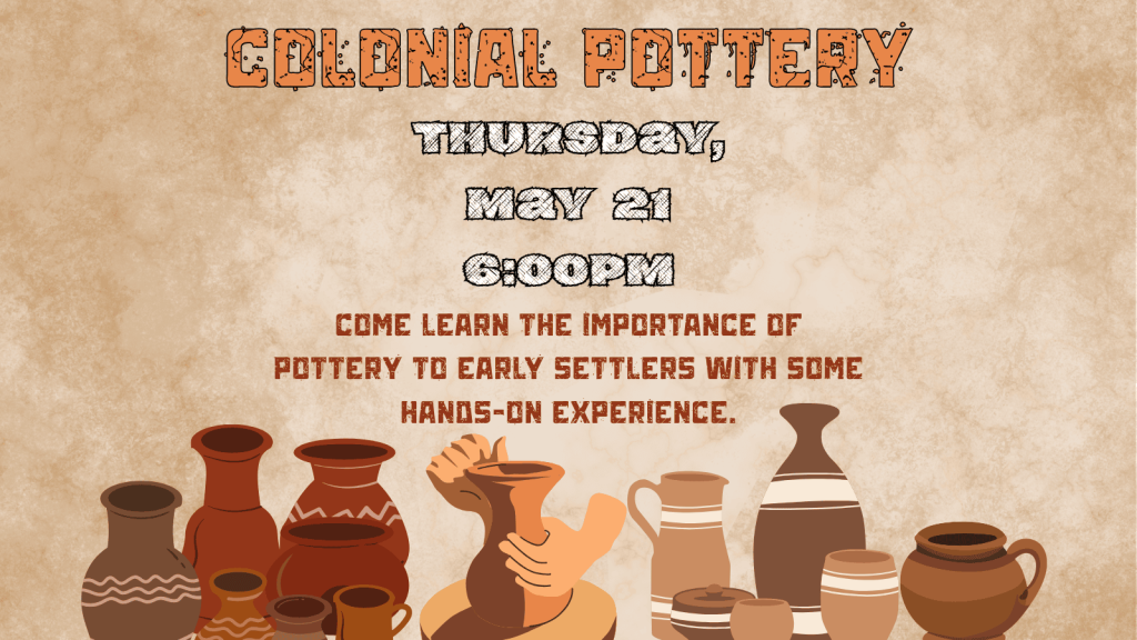Event Type: Adult ProgramAge Group(s): Adult Date: 5/21/2026 Start Time: 6:00 PM End Time: 7:30 PM Description: Perennial favorite Amy Roadman returns to demonstrate pottery, with a special focus on its importance in everyday life during the Revolutionary era.
